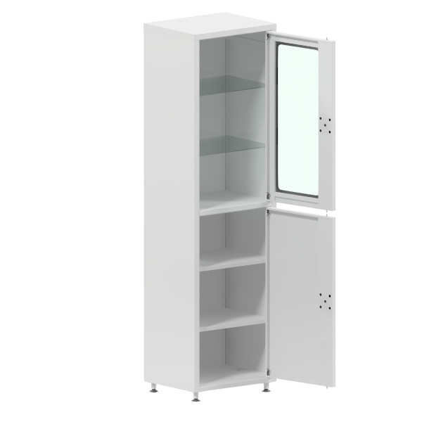 Две дверцы, каждая с ригельным замком. Верхняя дверца со вставкой из стекла.